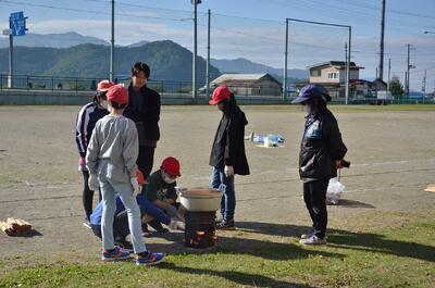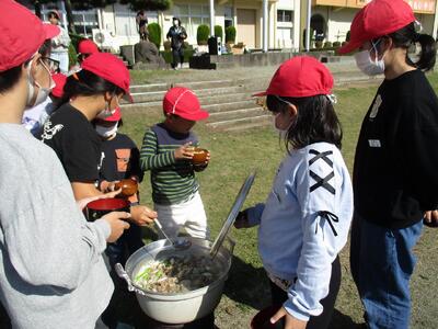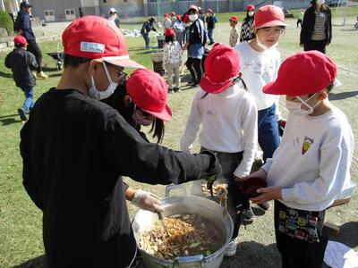 各学年で役割分担をして、縦割り班の仲間たちと力を合わせて、いも煮を作りました。