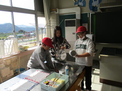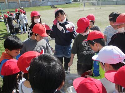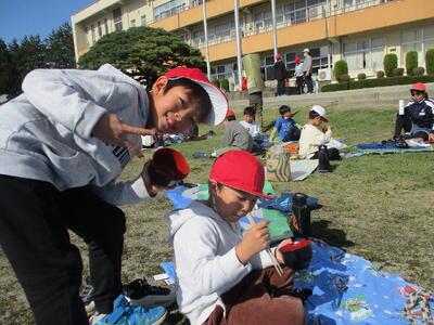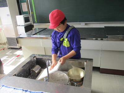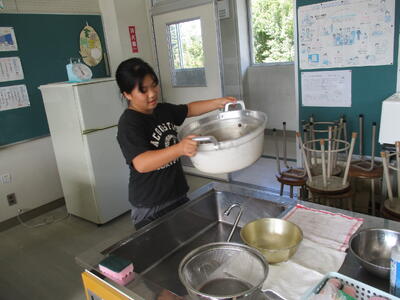 芋煮会の後、5年生が中心となって鍋やまな板などの片づけを行いました。洗剤を使って一つ一つ丁寧に洗い、片付けまでしっかりと取り組みました。