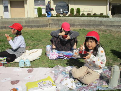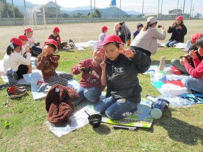 1~4年生が、分担して、しめじ、こんにゃく、ねぎなどの材料を切ったりほぐしたりしました。そして、グラウンドにそれぞれが準備した食材をもち寄り、なべで煮込みました。