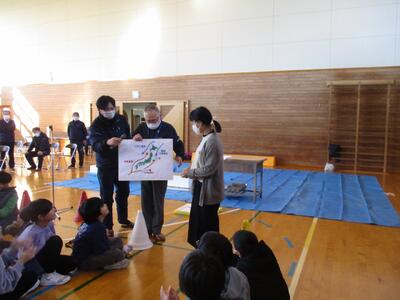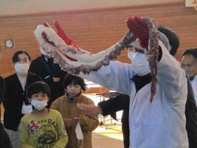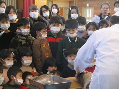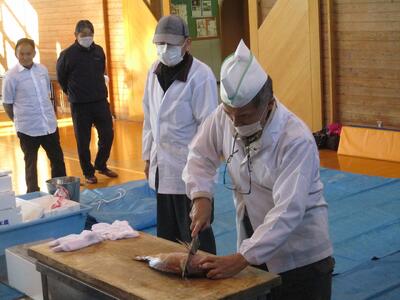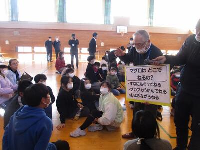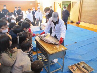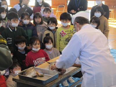 5時間目に体育館で、「お魚出前講座」を行いました。東根市学校給食物資納入協力会海産物部会や東根市や天童市の鮮魚店の方々にお越しいただき、魚についての説明やさばき方の実演などをしていただきました。