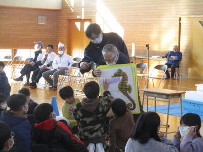 魚についての説明では、魚の名前や海流、魚に関する豆知識などについてクイズを交えながらお話しいただきました。子供たちは、知っている魚の名前がクイズに出るたびに、「マンボウ!」「タツノオトシゴ!」などと答えながら魚について学んでいました。