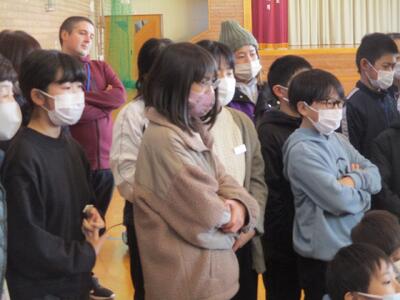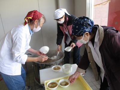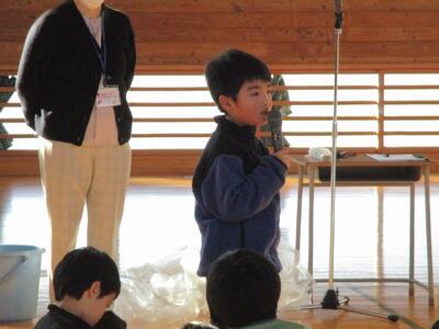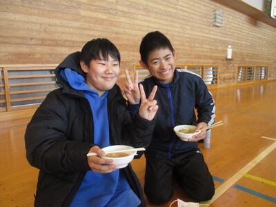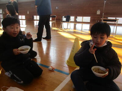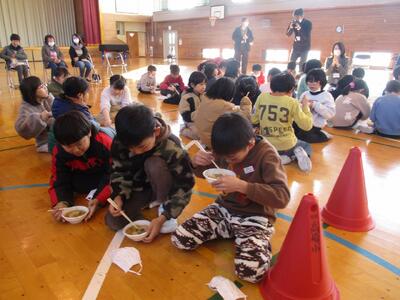 最後に、講師の方々が作ってくださったつみれ汁を食べました。おいしさのあまり、2杯、3杯・・・とおかわりをする子が大勢いました。「おいしいね。」「体が温まってきた。」と、おいしいつみれ汁を味わいました。