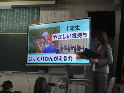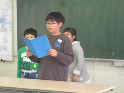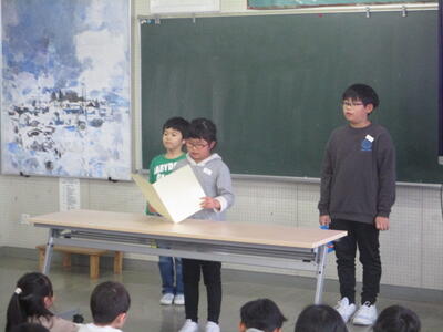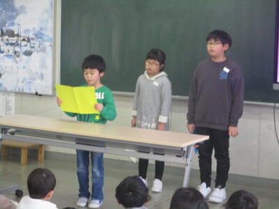 2学期の振り返りの発表では、代表の3人が、生活科や総合的な学習の時間で、頑張ったことを中心に発表しました。森林マルシェやノースガーデンプロジェクト、防災「絆」フェスなど、今年度の総合的な学習は、どの学年も課題に向かって学び続けていましたね。