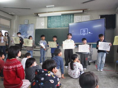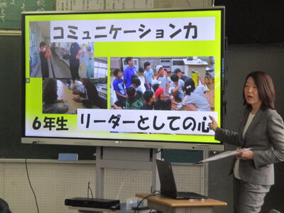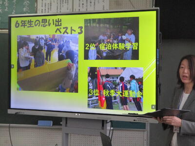 校長先生の話では、各学年の思い出ベスト3や2学期に成長したことについてお話しいただきました。子供たちは、自分の学年のことはもちろん、他の学年の子がどんな勉強をしたのか、どんな力がついたのかも真剣に聞いていました。事前にアンケートをとった思い出ベスト3では、「運動会じゃない」「芋煮会!」などと、答えを予想しながら2学期を振り返っていた様子でした。