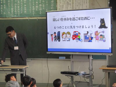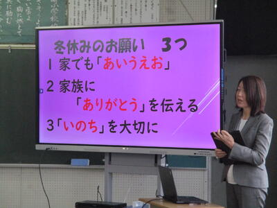 話の最後に、冬休みに向けて頑張ることを3つお話しいただきました。家族や友達、親戚の方や地域の方など、たくさんの人に「ありがとう」を伝え、充実した冬休みにしましょう。