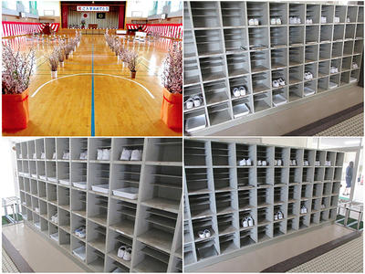 整然と並んでいる啓翁桜を生けたポット,そして,向きと置く場所が全員そろっている児童昇降口の児童上履き。
