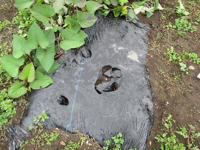 高崎農園に,ヤミに紛れて野生のイノシシが訪れたようです。周辺に,足跡や鼻先で土を掘り返した跡がついていました。また,マルチに穴があいていたり,サツマイモが掘り起こされてかじられたりしてもいました。ジャンボキャベツを食べようとした跡も認められました。