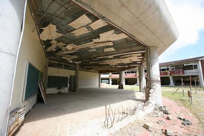 学校の中は,地震後に流れてきた油による火災で,焼けただれています。